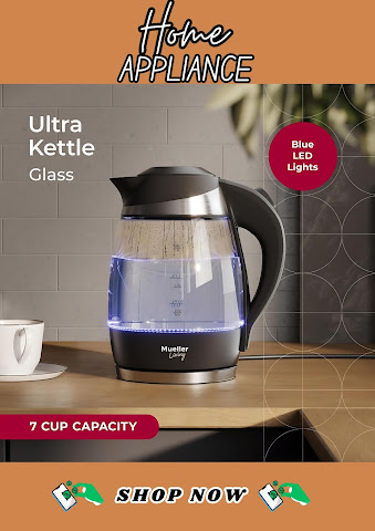 The Mueller Ultra Kettle (M99S) is a 1.8 liter cordless electric kettle that boils water quickly with its 1500W SpeedBoil technology. It features a borosilicate glass body for a clear view of the water and an LED light that indicates boiling. Safety features include auto shut-off and boil-dry protection for peace of mind.